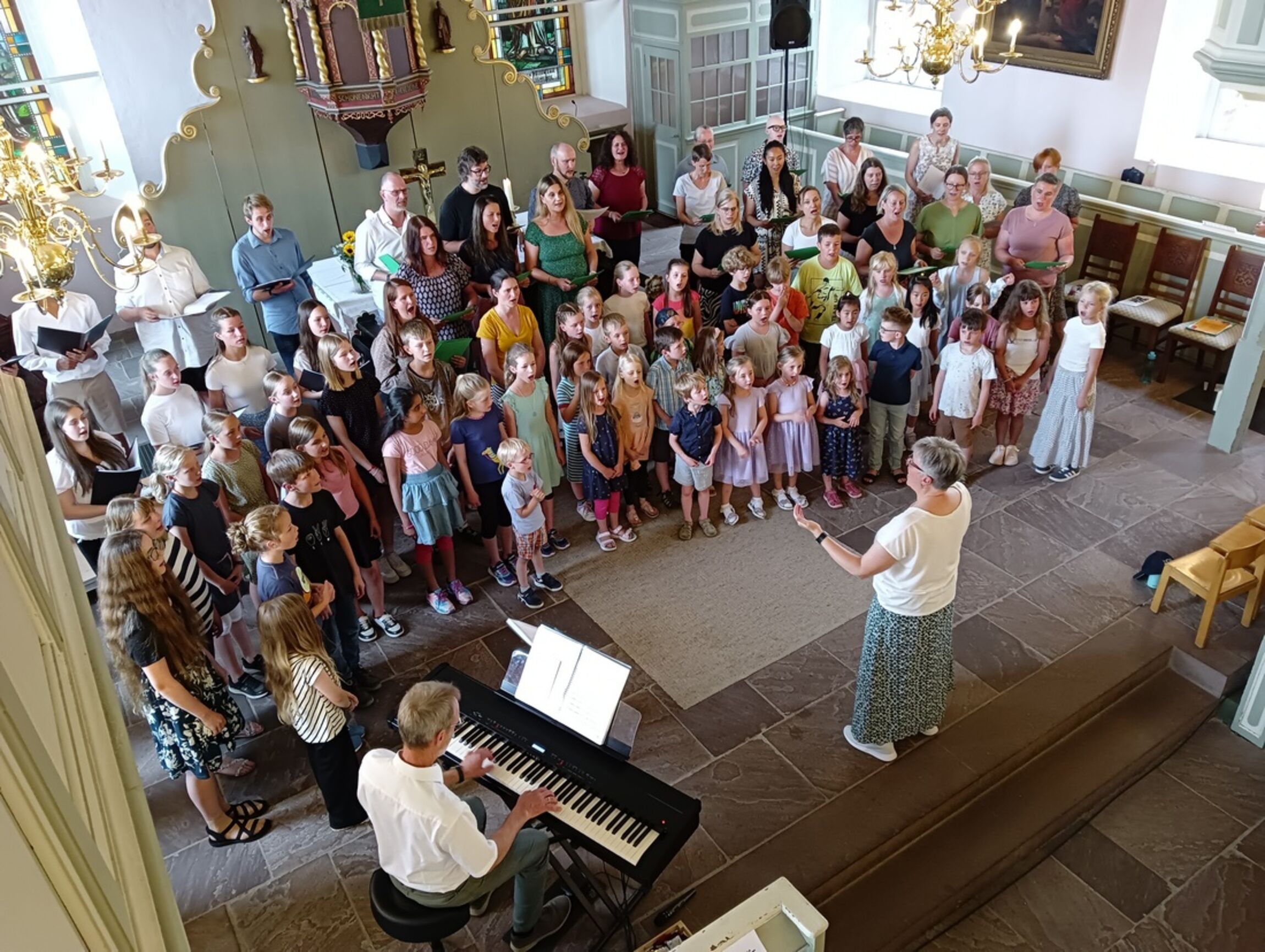 So erlebten wir ein gutes Dutzend Chorauftritte der Kinder, Jugendlichen und Erwachsenen in verschiedenen Kombinationen; beim Finale standen alle Sänger und Sängerinnen im Altarraum dicht gedrängt und tauchten mit sanften Tönen den Sommerabend in leuchtende Farben. Vielen, vielen Dank für dieses schöne Konzert!