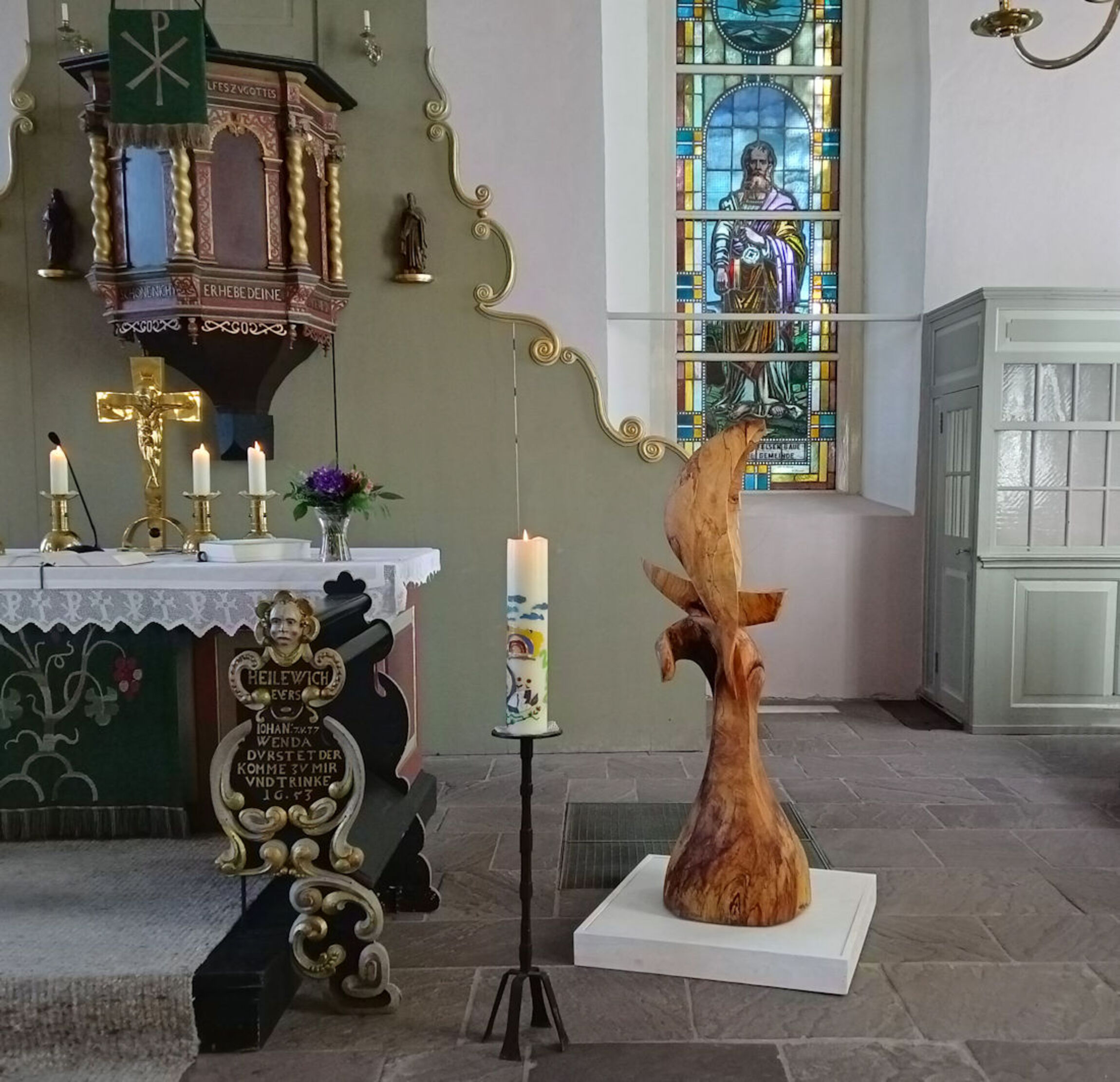 In einem feierlichen Taizé-Gottesdienst wurde am 28.06.2025 die eindrucksvolle Holzskulptur "Schiff auf Welle", geschaffen von dem Horstener Künstler Thorsten Schütt, enthüllt und zum dauerhaften Verbleib in unserem Kirchraum von St. Nicolai aufgestellt.